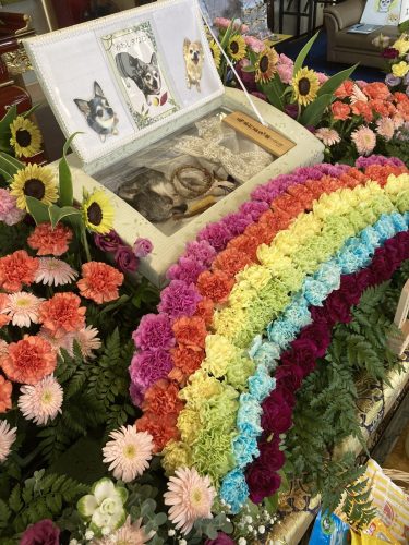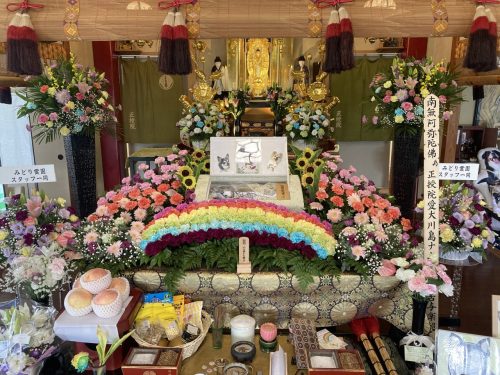 祭壇には虹をモチーフにしたお花が飾られ、そのまわりには、なむちゃんをイメージした可愛らしいお花たち...